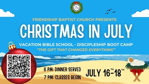 Friendship family, everyone is invited to attend Discipleship Bootcamp (aka, Vacation Bible School) being held Tuesday, July 16th - Thursday, July 18th from 6-9 p.m. here at the church. Our theme this year is 'Christmas in July.' Dinner will be served nightly starting at 6 p.m., followed by classes starting at 7 p.m. Children, youth, and adults are invited to attend classes where we'll focus on the Christmas story and learn why Jesus is the Gift that Changed Everything. Please register so we can prepare meals and learning materials, accordingly. All adults who register before Sunday, July 14th will receive a complimentary gift! Be one of the first 50 adults to register on or before Sunday, July 7th and your name will be entered into a drawing to save 50% on a ticket to our Christmas Gala in December! (Note: You must attend Discipleship Bootcamp at least one night to be entered into the drawing). We'll see you at Discipleship Bootcamp! To register: CLICK HERE