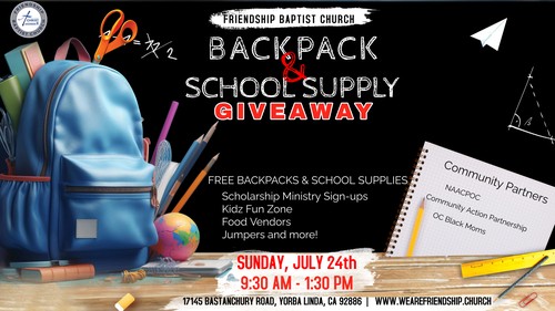 Our Back to School Backpack and School Supply Giveaway will take place on Sunday, July 24th from 9:30 am to 1:30 pm. YES CHURCH IS STILL TAKING PLACE! We are partnering with the NAACP of Orange County to kick off the 2024-2025 school year.