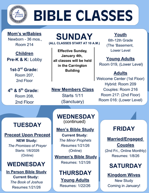 GriefShare resumes here at Friendship on January 20, 2026. Please consider joining us as we navigate this journey together. You can register by going to the church website, select connect then ministry then Outreach scroll down to GriefShare click the logo and then search for current group.