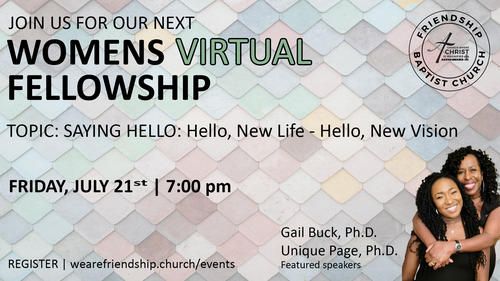 Join us on Friday, July 21st at 7:00 pm for the FBC Women’s Ministry virtual monthly fellowship.