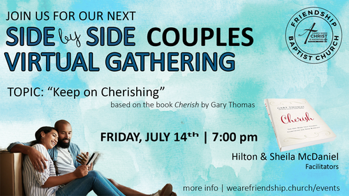 The next virtual Side by Side Couples Ministry class is scheduled to take place on Friday, July 14th at 7:00 pm. via zoom. We are studying the book Cherish by Gary Thomas. The topic for our upcoming session is “Keep on Cherishing”. No registration needed. The link to join the ZOOM class on Friday evenings is listed HERE. Should you have any questions, please contact Deacon Hilton McDaniel (949) 652-1489 or email Sheila McDaniel HERE. We look forward to you joining the class.