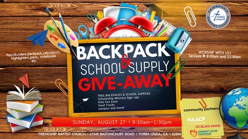 Our Back to School Backpack and School Supply Giveaway will take place on Sunday, August 27th from 9:30 am to 1:30 pm. YES CHURCH IS STILL TAKING PLACE! We are partnering with the NAACP of Orange County to kick off the 2023-2024 school year.