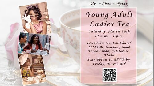 On Saturday, March 16. We will have the young adult ladies tea. For more information, you may scan the QR code above. For more info please contact LeShon Archer, in our Christian Education & Discipleship ministries HERE. We would love to have the young adults ladies (Ages 18-35) participate in this tea as we seek to connect generationally with them.