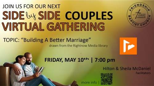 The Side by Side Couples Ministry is starting a new study titled, Building a Better Marriage. This study starts on Friday, May 10th @ 7pm and invites married/engaged/seriously dating couples to explore God's blueprint for building a healthy marriage through trust, honesty, service, love, and God's Word. This series is offered through Right Now Media and the class will be facilitated online by Deacon Hilton and Sheila McDaniel. To register and join the study go HERE.