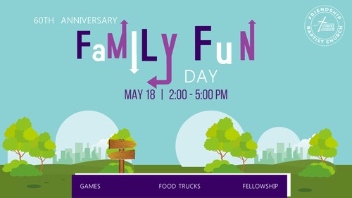 Saturday, May 18th, is a family fun day from 2 to 5 pm with games, food trucks, and more. You can bring your food or purchase from the food trucks. The church will provide all the snacks and beverages.