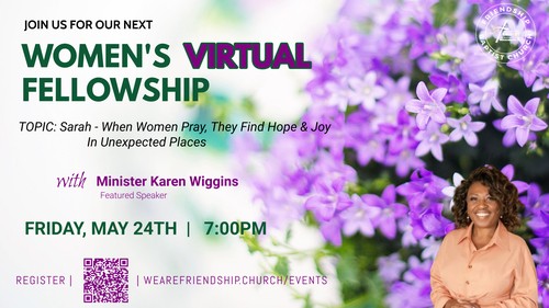 Women of Friendship, please note the next Virtual Women’s Ministry Monthly Fellowship will take place Friday, May 24th, at 7:00pm