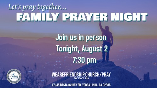 Tonight we will have an in-person Family Prayer Service on Friday, August 2nd, at 7:30 p.m. in the Sanctuary. Join us for worship and prayer. Our last in-person prayer meeting was wonderful, and we look forward to another powerful time together. You can view our prayer list and see the theme for the month of August HERE.
