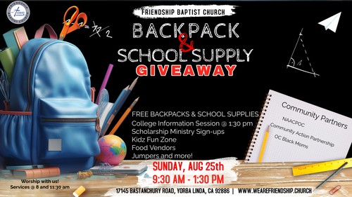 Our Back to School Backpack and School Supply Giveaway will take place on Sunday, August 25th from 9:30 am to 1:30 pm. YES CHURCH IS STILL TAKING PLACE! We are partnering with the NAACP of Orange County to kick off the 2024-2025 school year.
