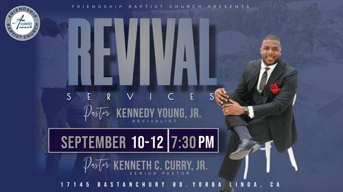 Revival 2024, to be held September 10th -12th. Services take place in person at 7:30 pm nightly here at Friendship. Our guest speaker is Pastor Kennedy Young of the East Gate Missionary Baptist Church of Dallas, TX. We are excited about all that God is going to do at this year’s Revival.