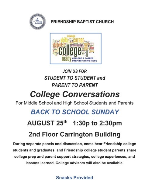 Right after the 11:30am service, at 1:30 pm, our College & Career Prep Ministry will be hosting a College Information Dialogue Session. There will be two separate panels: One for future college students and another for parents. Friendship, this is a great opportunity to invite families you know to worship with you and get ready for the school year.
