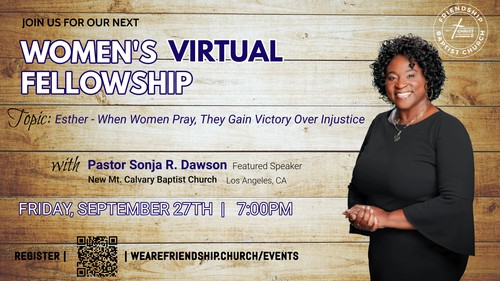 Kingdom Women – Join us for our Virtual Women’s Ministry Monthly Fellowship on Friday, September 27th at 7:00 p.m. Our guest, Pastor Sonja R. Dawson, will teach about Esther - When Women Pray, They Gain Victory Over Injustice based upon the book When Women Pray - 10 Women Who Changed The World Through Prayer by Bishop T.D. Jakes. Bishop Jakes writes,