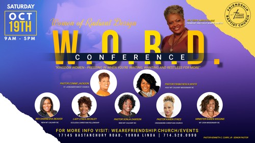 Ladies, we are excited to kick off the 32nd annual W.O.R.D. (Women of Radiant Design) Conference tomorrow, October 19th, starting at 9 a.m. here at Friendship! The theme this year is “Kingdom Women: Pressing in When You’re Waiting, Wanting, and Restless for More.” Over 300 women will gather, but there’s still room for you! You can register onsite if needed. Or, save time by registering HERE.