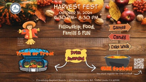 Our Harvest Festival is on Thursday, October 31st, from 6:30-8:30 p.m. This will be a fun event for all ages with games, a cake walk, cotton candy, and more! Come out in costume. We encourage everyone to create or find a Bible-themed costume or character. Adults may NOT wear masks. We’ll also have a trunk-or-treat and a chili cook-off. We’re asking our ministries to sign up to host a booth or game.