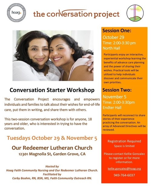 We are promoting the Conversation Starters Workshop, which will be held at Our Redeemer Lutheran Church in Garden Grove. This two-session workshop helps families and individuals discuss their wishes for end-of-life care.