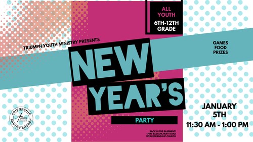 Calling all youth 6th-12th Grade! Sunday, January 5th @ 11:30 am in the Carrington Building Basement. Let's get together and celebrate the new year and plan and pray for what's ahead. We are planning a fun time of games, music, food and prizes. Feel free to bring your friends!