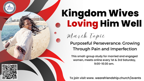 Then Ladies! The Kingdom Wives Class meets this Saturday, March 1st, online from 9:00-10:30 AM. This discipleship group will continue to explore the value of being a Kingdom Wife, and this week’s topic is “Purposeful Perseverance” from the book Loving Him Well.