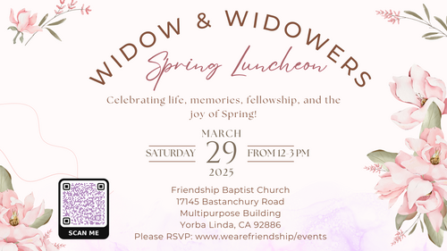 Immediately following the GriefShare seminar, on Saturday, March 29th, we invite all widows and widowers to join us for a special luncheon hosted by the Christian Education and Deacon Ministry from 12:00-3:00 PM.