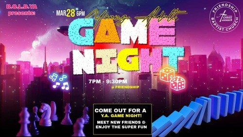 Young Adult Chill! Calling all Young Adults (18-35)! Come hang out. Fun, food, games, and fellowship on Friday, March 28th 7-9:30 PM.