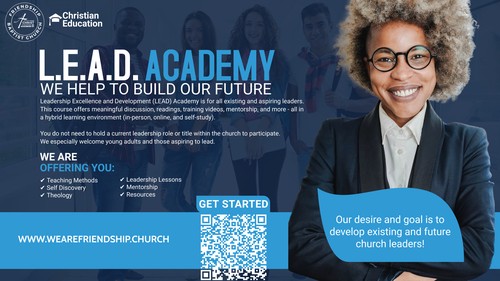 Aspiring and current leaders are encouraged and invited to participate in Leadership Excellence and Development Academy, which begins on Thursday, April 4th at 7:30 p.m. LEAD Academy is designed to equip aspiring and emerging leaders with essential leadership skills, tools, and resources, and offers a blend of theological insight and practical application. Our desire and goal is to develop existing and future church leaders! If that's you, we welcome you to join us for LEAD Academy 2025! To register: go HERE