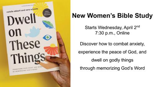 NEW WOMEN'S BIBLE STUDY All ladies are invited and welcome to join the Women's Bible Study class as they start a new study titled, Dwell on These Things. This study journeys through the book of Philippians and starts Wednesday, April 2nd at 7:30 p.m. online. To register: go HERE