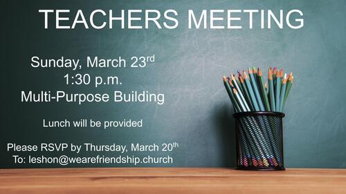 All Bible teachers are invited and requested to attend our 1st quarter Teachers Meeting on Sunday, March 23rd at 1:30 pm. We'll gather in the multi-purpose building to share updates and pertinent topics related to Christian Education and Discipleship. Lunch will be provided, so please RSVP to our Minister of Christian Education at: [email protected] by Thursday, March 20th to confirm your attendance. We look forward to seeing you there!