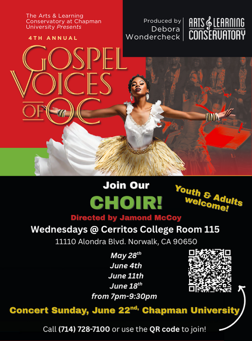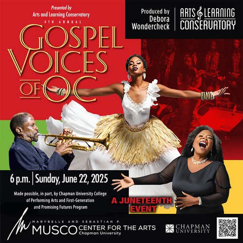 Join us for the 4th annual Gospel Voices of Orange County by being a part of the choir! Celebrate Juneteenth and take part in this magnificent showcase of African American artistry. Four rehearsals will take place on Wednesdays from May 28th - June 18th with the event taking place on June 22nd at Chapman University's Musco Center for the Arts.