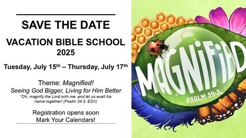As we look ahead to July, make sure you save the date for Vacation Bible School 2025 happening Tuesday, July 15th through Thursday, July 17th.