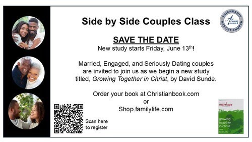 Calling all couples! Friday, June 13 our Side by Side Couples Class will begin a new six-session study: “Growing Together in Christ.” This class is for married, engaged, or seriously dating couples who want to deepen their spiritual intimacy. It meets online at 7 p.m. every 2nd Friday. We encourage all couples to join and grow together.