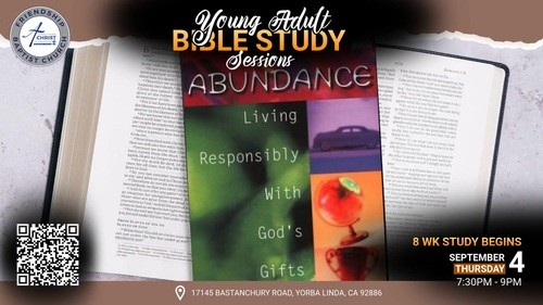 YOUNG ADULT BIBLE STUDY - Abundance: Living Responsibly With God's Gifts will guide us into the biblical understanding of abundant life and help us sort out many of the faithful and practical issues that come together in a life of abundance. Seven chapters offer Bible verses and discussion questions about "a life of joy," "material abundance," "over-indulgence," "Living simply," "money," "ways in which we are handled by our stuff," and "ethics." We'll wrestle with our personal finances, seeking always to discern the will of God.
