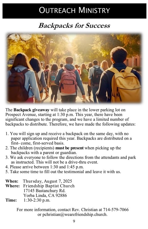 Where: Friendship Baptist Church 17145 Bastanchury Rd., 92886