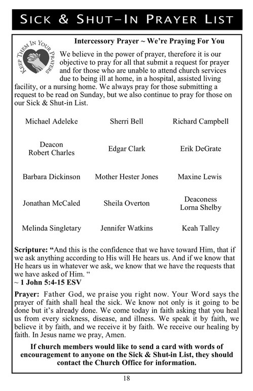 In order for us to get all prayer requests ready for prayer during Sunday services, we ask that you call or send in your prayer request before Friday morning. Requests sent in after Friday will be on the following week’s prayer list. Send requests to Leigha Carrington at [email protected] or 714-579-7072 or no later than 7:30a.m. on Sunday morning to Sharon Preston at [email protected] or 714-579-7060.