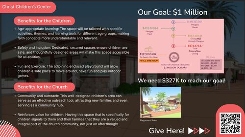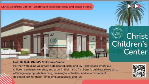 As you know, Giving Tuesday happened earlier this week, but we want to highlight this again. We are asking you to partner with us, especially with your year-end giving, as we build Christ’s Children’s Center. This will be a dedicated, safe, and joy-filled space where our children can learn, worship, and grow. The children’s building and the adjoining playground will allow us to offer age-appropriate teaching, meaningful activities, and an engaging space designed just for them. Your giving helps us build for the next generation.