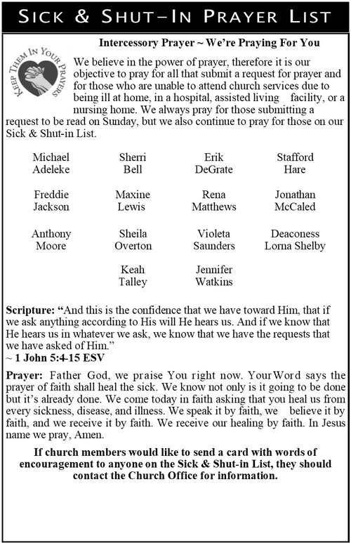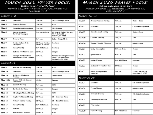 In order for us to get all prayer requests ready for prayer during Sunday services, we ask that you call or send in your prayer request before Friday morning. Requests sent in after Friday will be on the following week’s prayer list. Send requests to Leigha Carrington at [email protected] or 714-579-7072 or no later than 7:30a.m. on Sunday morning to Sharon Preston at [email protected] or 714-579-7060.