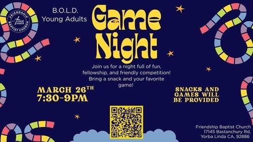 Who’s ready for some fun and games? The B.O.L.D. Young Adult Ministry invites all young adults (ages 18–35) to join us for Game Night on March 26th from 7:30–9:00 pm in the Basement. Come enjoy food, fun, fellowship, and friendly competition. Bring your favorite snack and board game, and get ready for a great evening together. Scan the QR code to register.