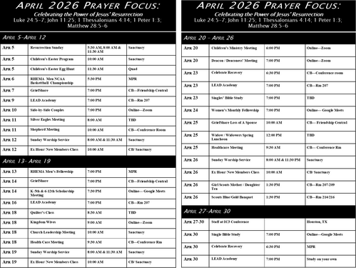 In order for us to get all prayer requests ready for prayer during Sunday services, we ask that you call or send in your prayer request before Friday morning. Requests sent in after Friday will be on the following week’s prayer list. Send requests to Leigha Carrington at [email protected] or 714-579-7072 or no later than 7:30a.m. on Sunday morning to Sharon Preston at [email protected] or 714-579-7060.